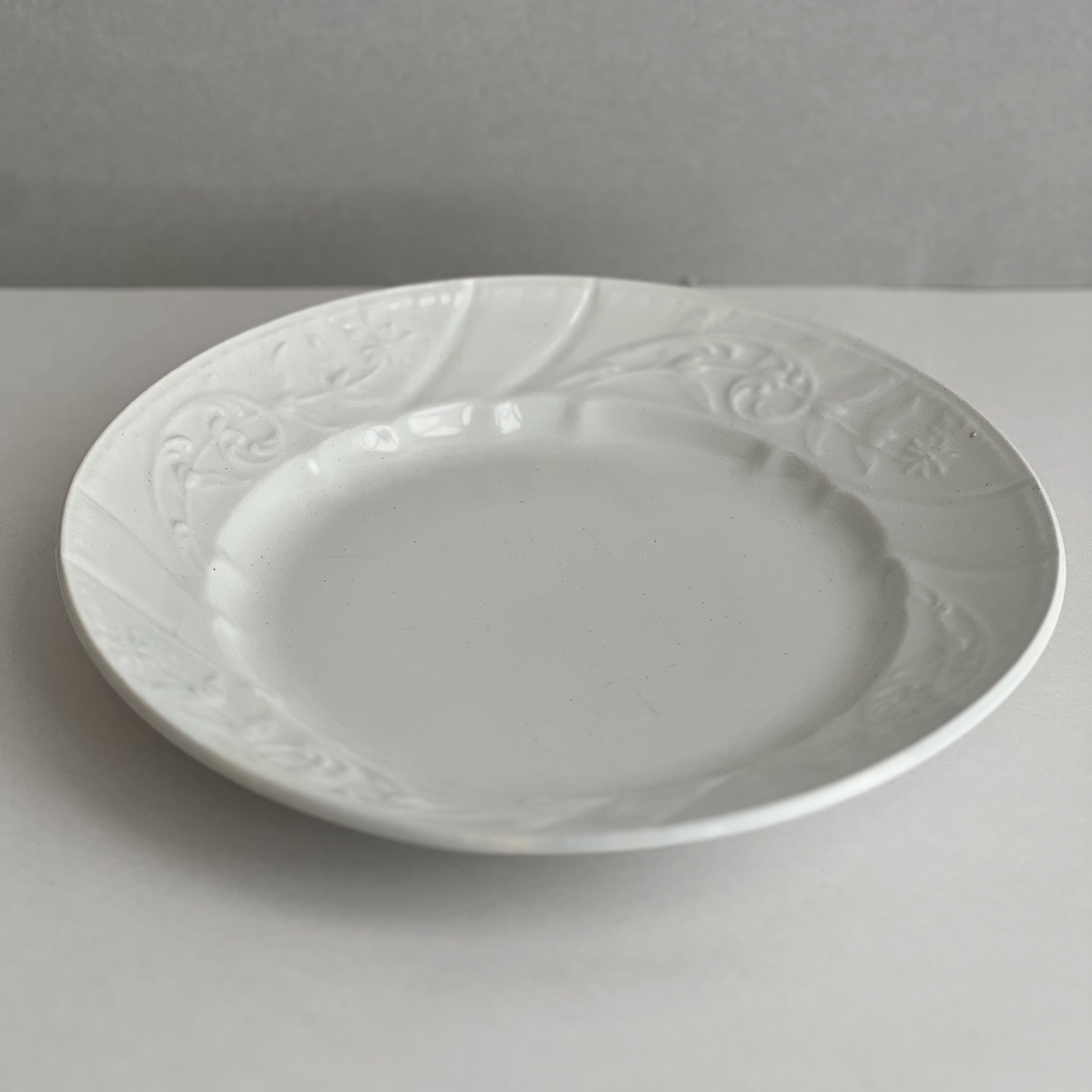 縁に花モチーフが入った繊細な白色の平皿です。