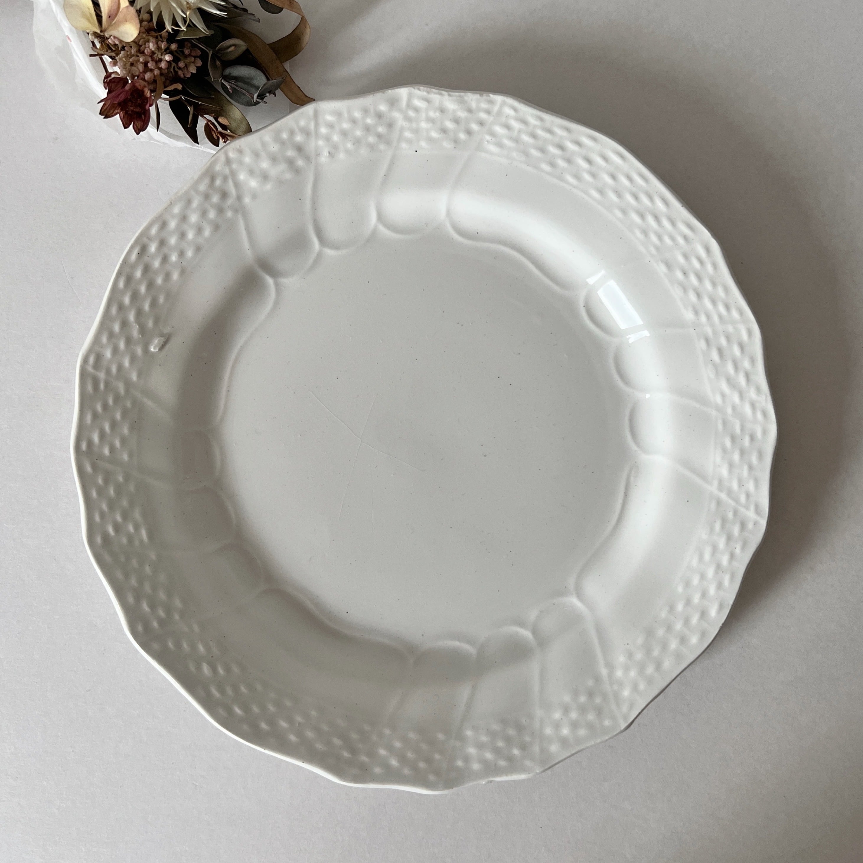 繊細なリムが印象的な白色デザートプレートです。