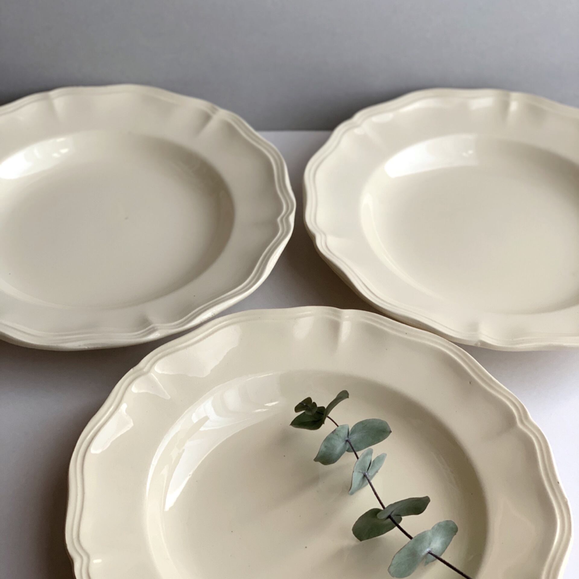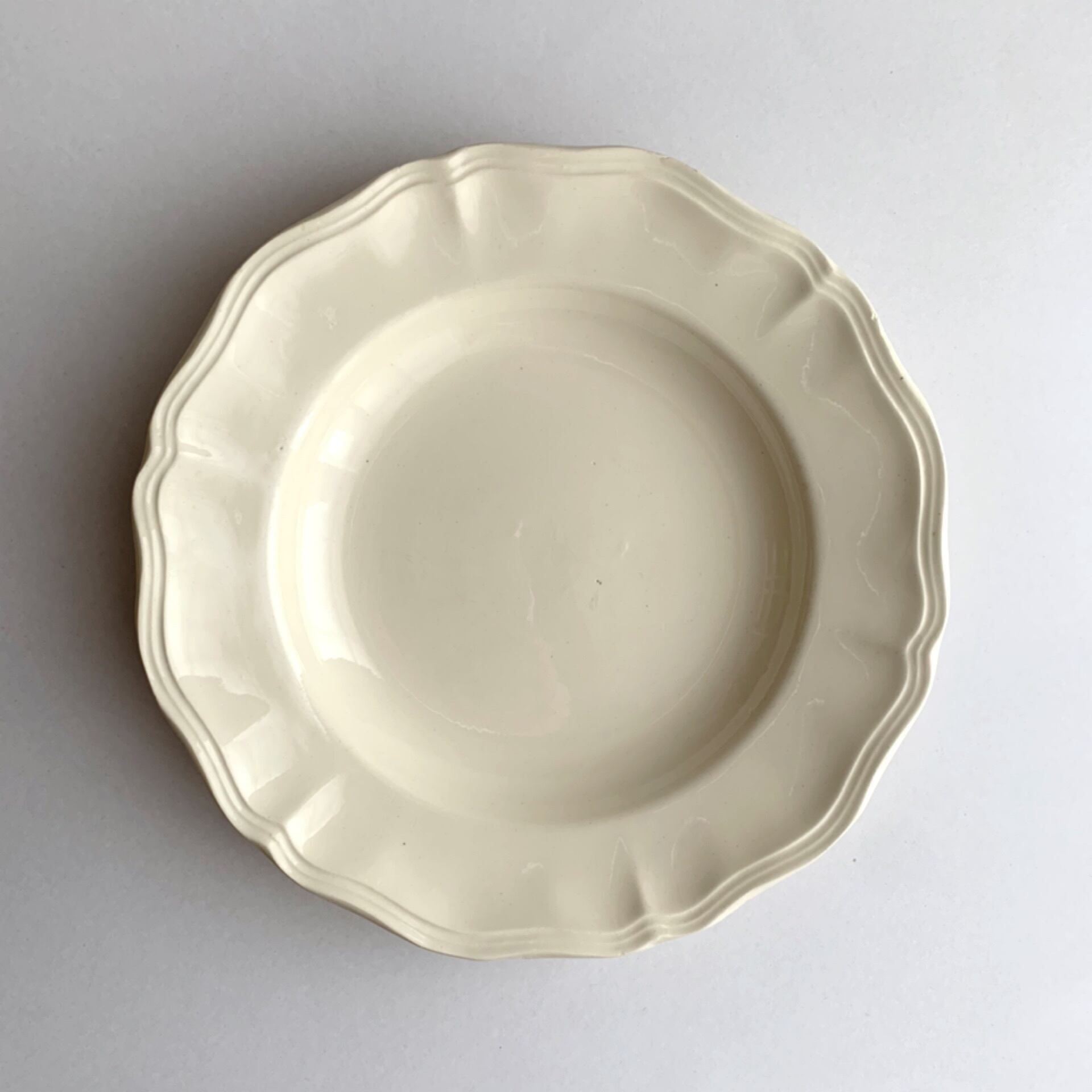 やわらかい乳白色が優しい、シンプルで使いやすい花リムプレート。