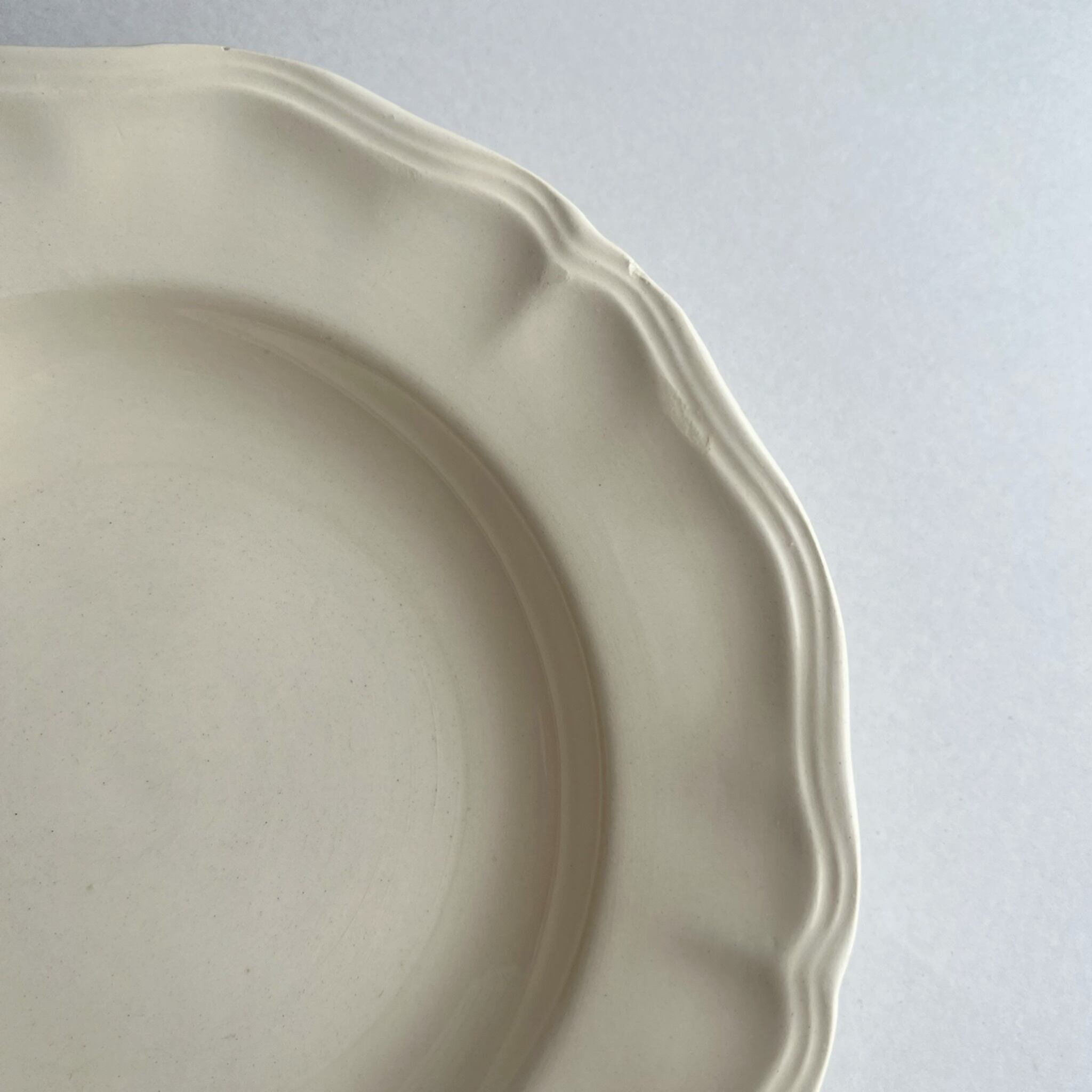やわらかい乳白色が優しい、シンプルで使いやすい花リムプレート。