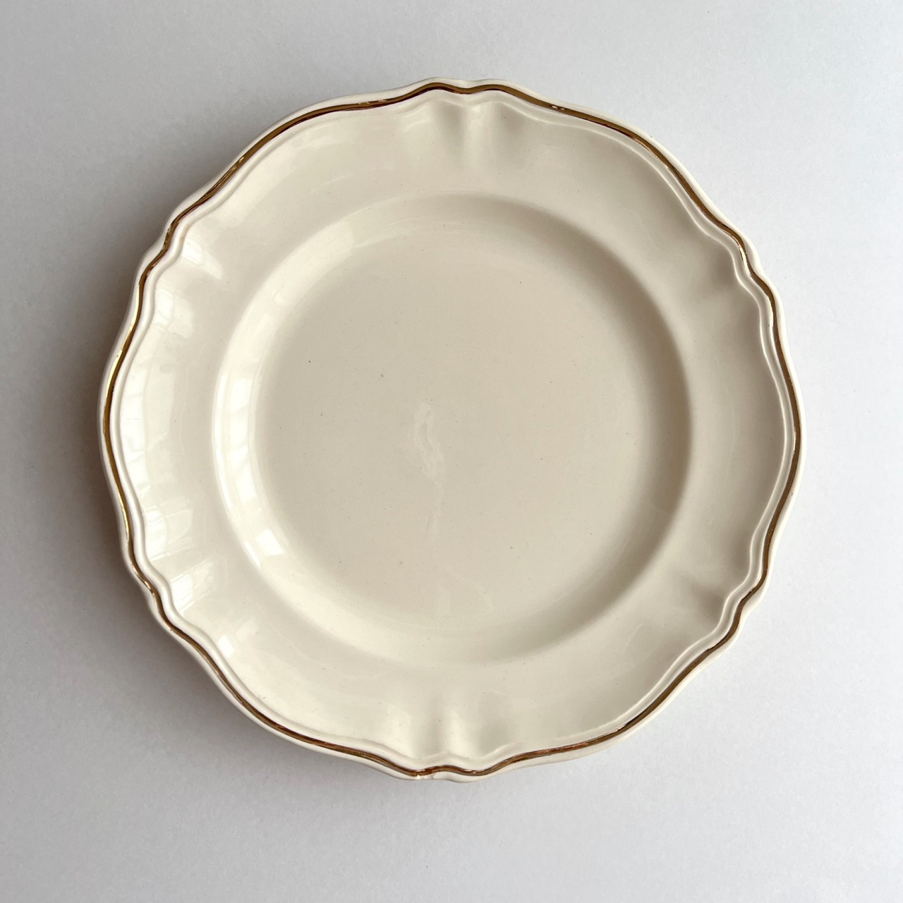 やわらかい乳白色が優しい、シンプルで使いやすい大きめ花リムプレート。