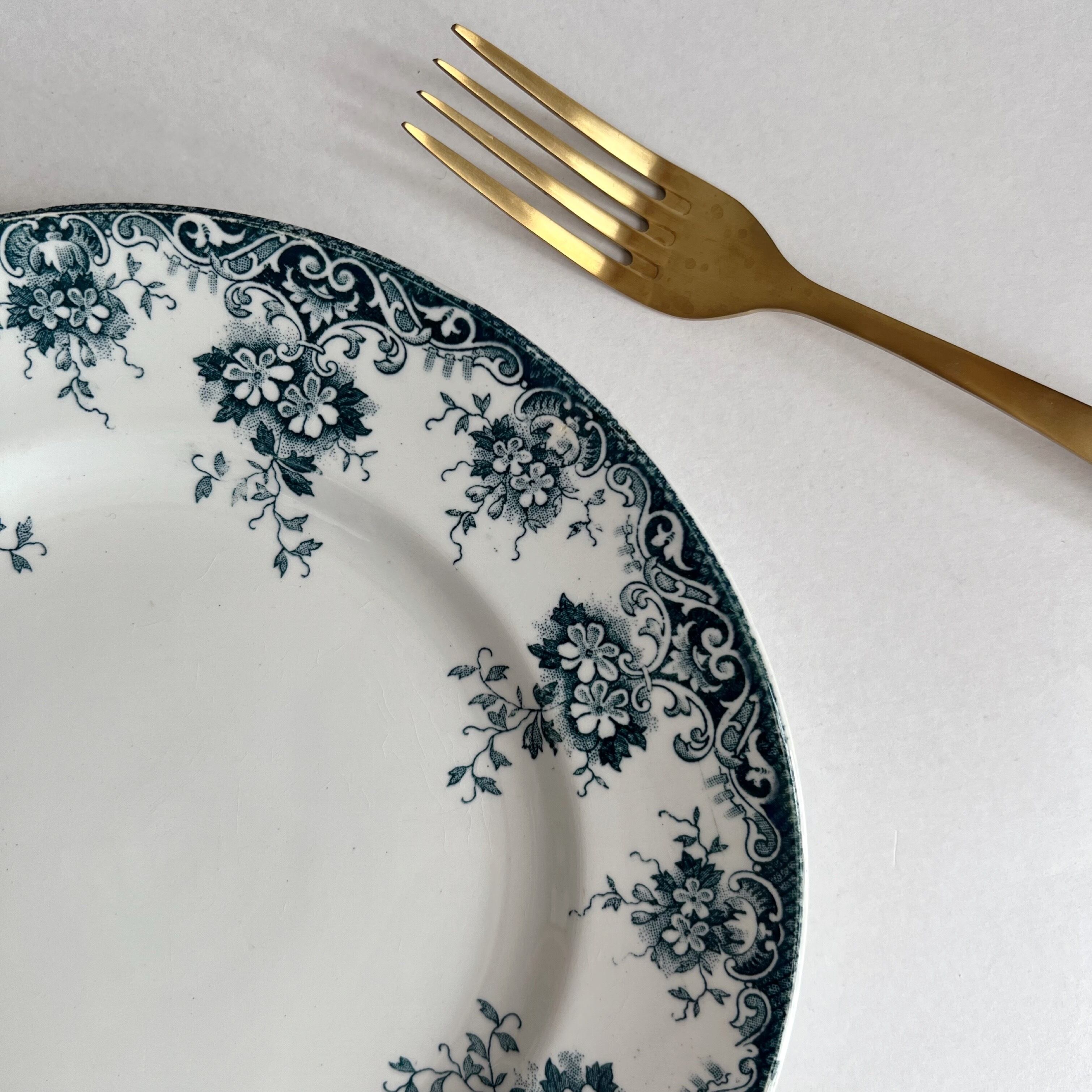 ブルーグリーンの花柄の転写が美しく繊細な1枚。