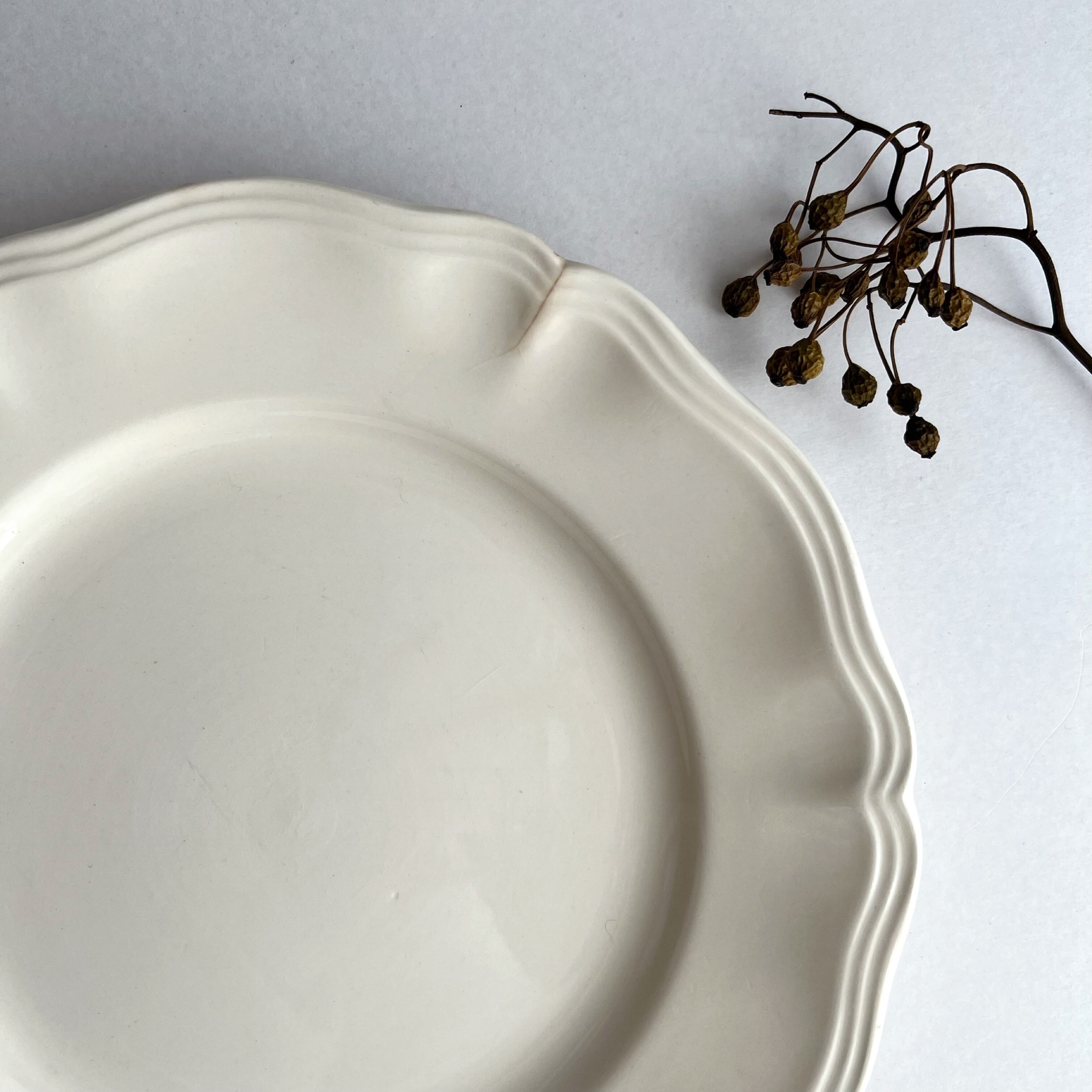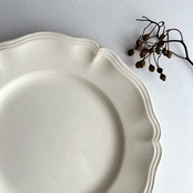 やわらかい乳白色が優しい、シンプルで使いやすい花リムプレート。