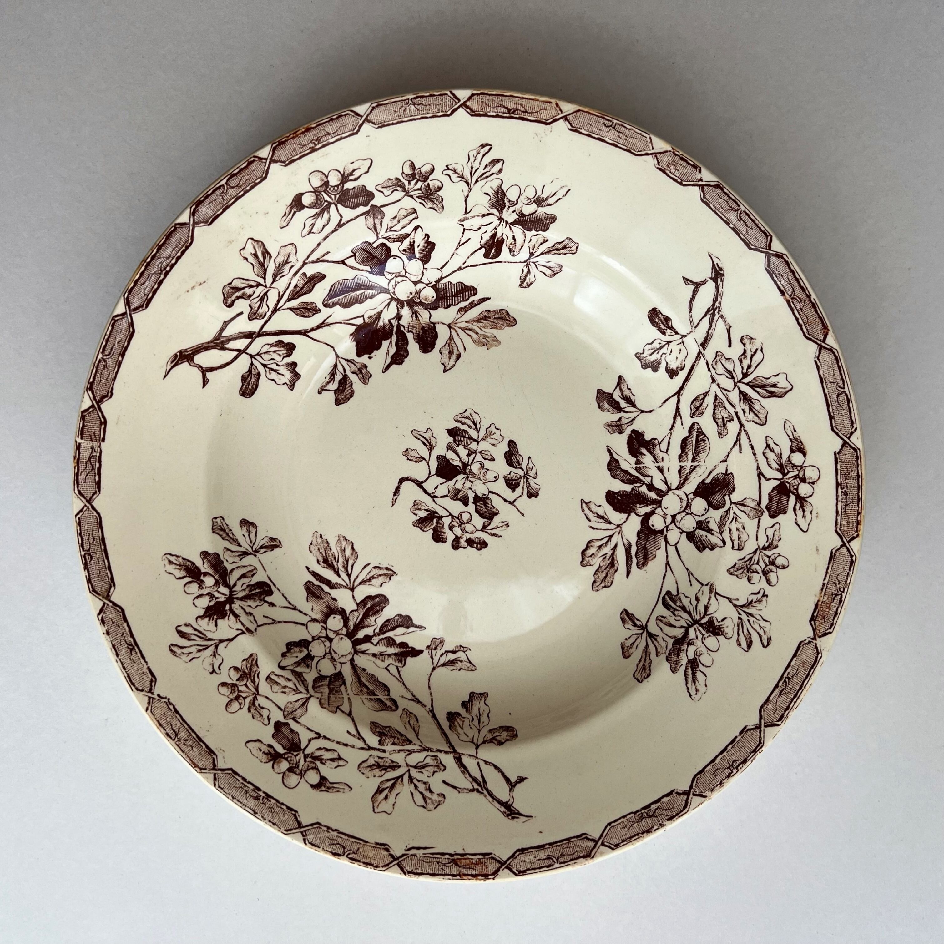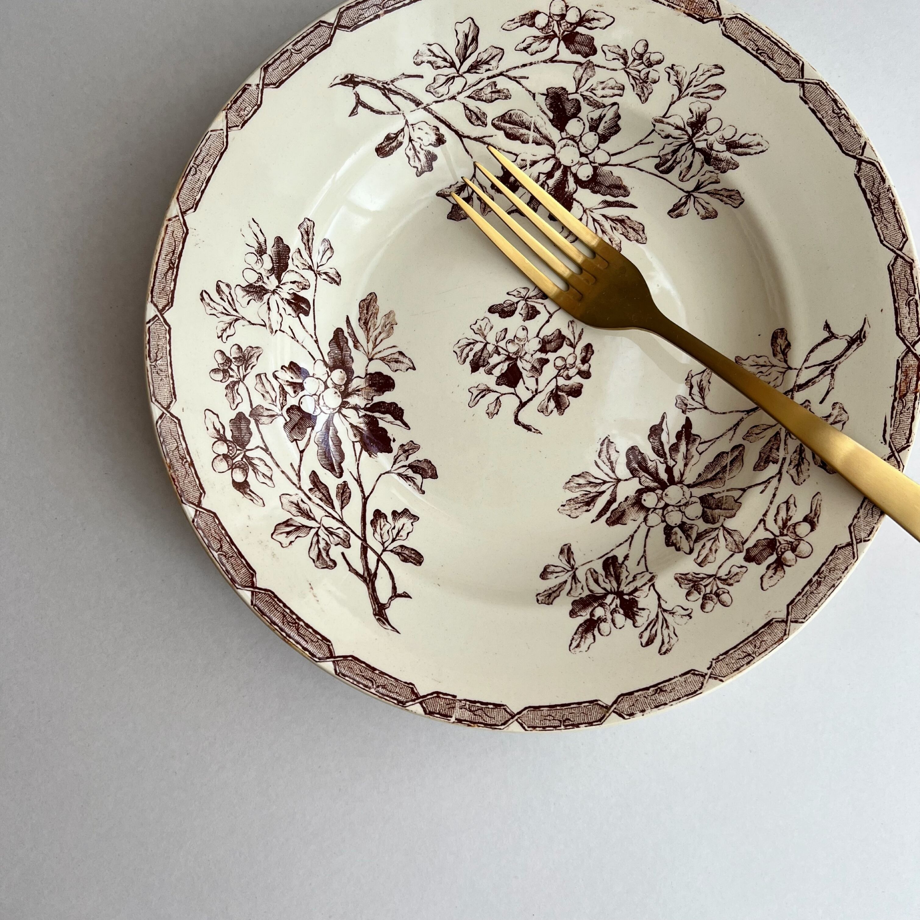 木の葉や木の実が描かれたブラウンの絵柄が愛らしいスーププレート。