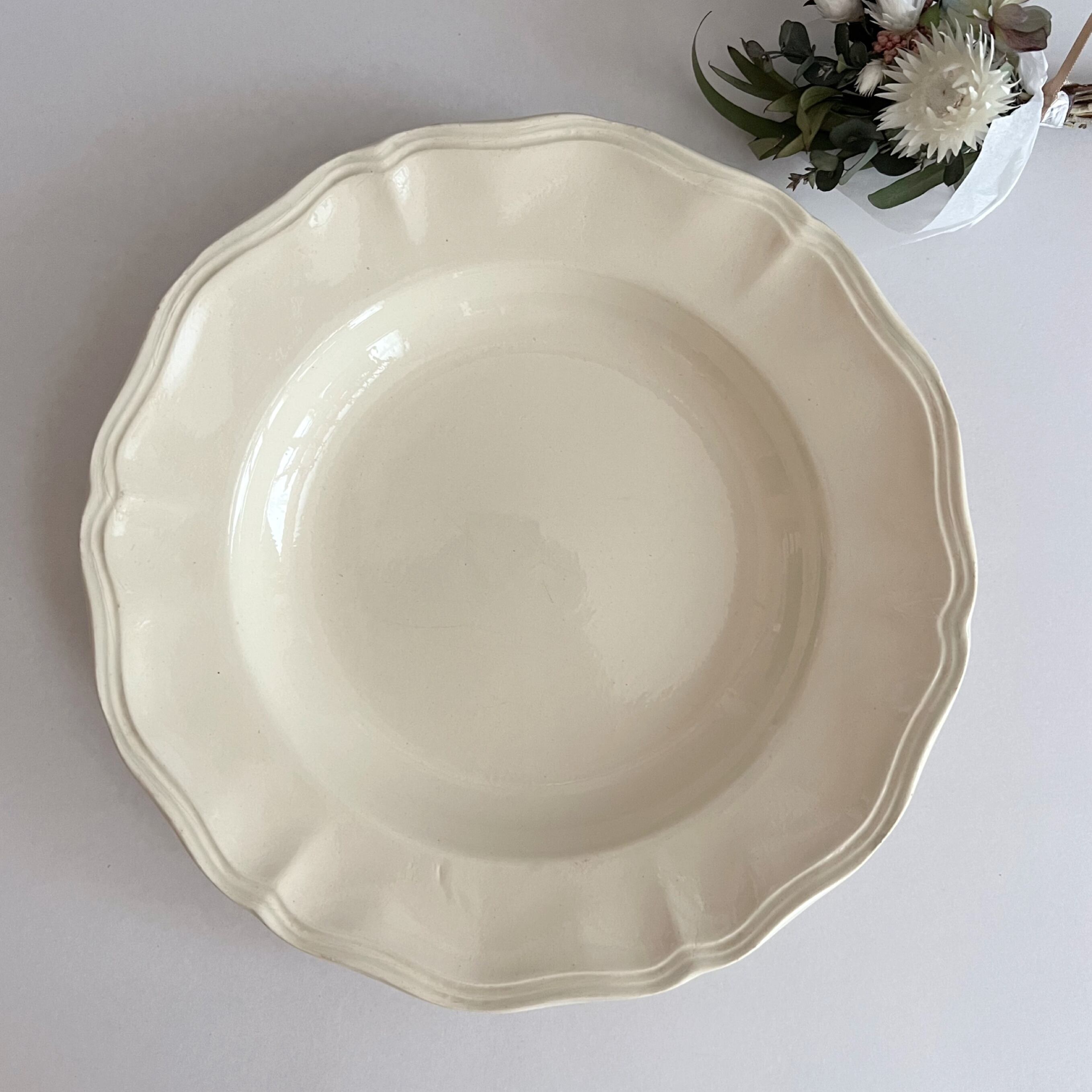 やわらかい乳白色が優しい、シンプルで使いやすい花リムプレート。