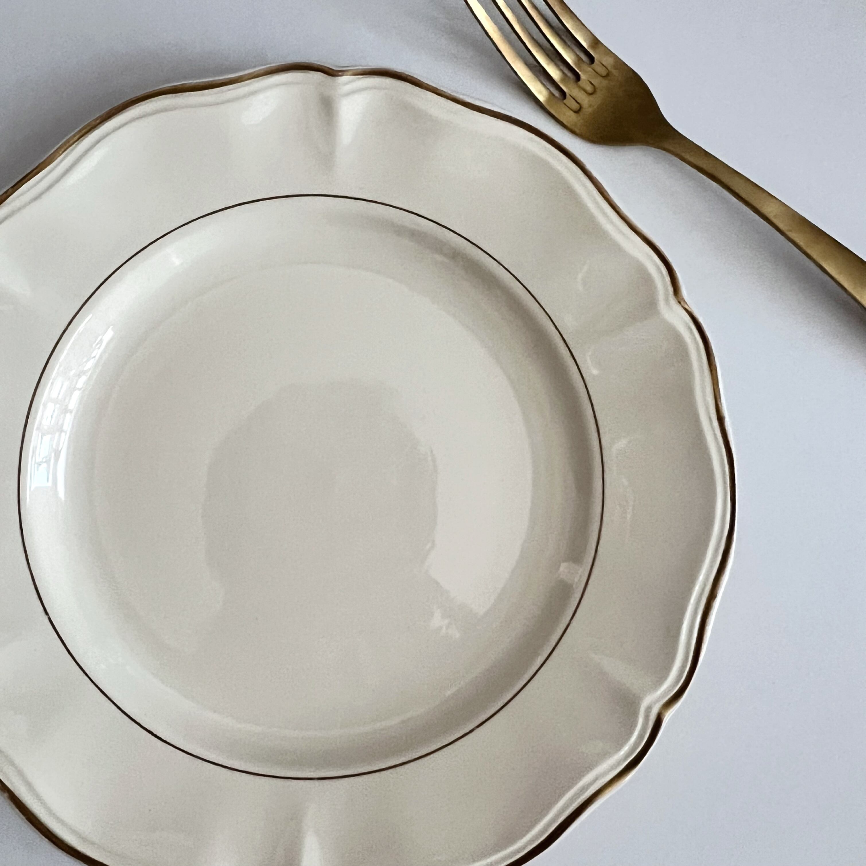 やわらかい乳白色に繊細な金縁のラインが美しい、シンプルで使いやすい花リムプレート。